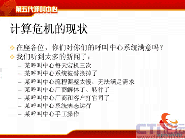 呼叫中心現(xiàn)在已經(jīng)了比較嚴(yán)重的計算危機,我聽到了很多,因為我重點是在搞技術(shù)這一行當(dāng),我就問一個問題,在座的各位,你們對你們的呼叫系統(tǒng)滿意嗎?我相信大部分人可能嘴上都說比較滿意,但是很多人對深層次的矛盾都非常清楚,為什么不滿意?