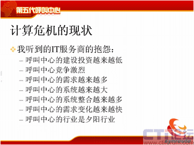 我們聽到IT服務(wù)商的抱怨可就更多了,說呼叫中心建設(shè)投資越來越低了,我在十年前建設(shè)一個20個座席的呼叫中心,能掙1500萬;可是現(xiàn)在20個座席的呼叫中心,10萬塊錢就把我打發(fā)了。呼叫中心競爭越來越激烈,投一個標(biāo),雖然一個呼叫中心只有100萬,這時候來的廠家有50家,相互壓價,相互壓價,這時候利潤都沒有了,F(xiàn)在的需求是越來越多了,體現(xiàn)在各個環(huán)節(jié),運營管理和業(yè)務(wù)模式上需求越來越多,最終客戶的要求也是越來越多,系統(tǒng)越來越大了,服務(wù)器也一大堆,以前一兩個服務(wù)器就夠了,現(xiàn)在需要4、5個,7、8個,這些服務(wù)器還需要相互進行聯(lián)絡(luò)整合,系統(tǒng)的整合越來越多,比如要和ERP整合,要和CRM整合,要和供應(yīng)鏈整合,系統(tǒng)的整合越來越多,而且需求變化越來越大,呼叫中心需求的變化產(chǎn)生于很多方面,后面我會仔細(xì)介紹。呼叫中心的行業(yè)變成一個夕陽行業(yè)了,這是現(xiàn)在做IT服務(wù)商普遍在提的想法。
