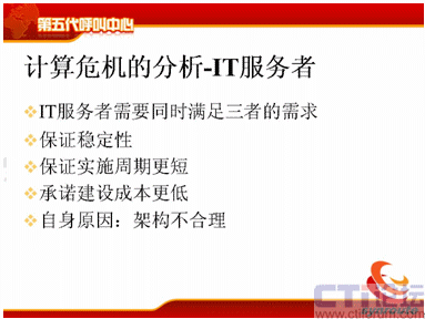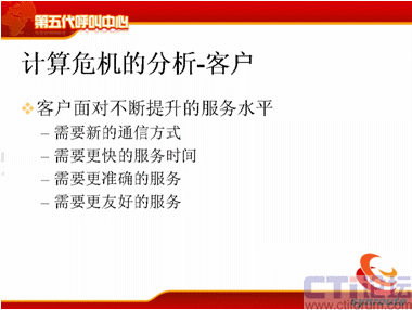 我分析一下計算的危機,計算危機來源于三個方面,第一是客戶面對不斷提升的服務(wù)水平,現(xiàn)在需要新的通信方式,包括電話、傳真、短信、電子郵件等等,還包括網(wǎng)上的護航瀏覽,表單共享,電子排版等等通信方式。第二方面需要更快的服務(wù)時間,80%的電話是20秒接起,可是短信的響應(yīng)時間為什么這么長,需要更準(zhǔn)確的服務(wù),電話的服務(wù)是什么樣的,我現(xiàn)在需要網(wǎng)上交談的服務(wù)質(zhì)量也能夠得到保障等等,這是客戶對IT服務(wù)者提供的壓力。