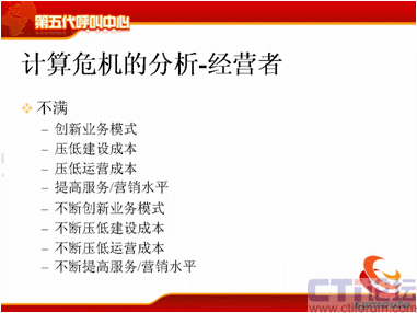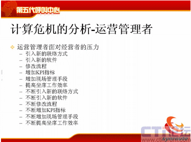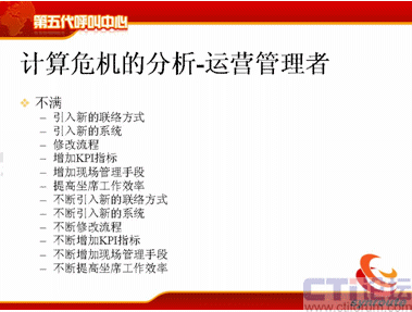 計算危機的下一方面是運營管理者,可能在座很多人是做運營管理的,你們會不斷去跟IT服務(wù)者提需求,我下一個月想引進新的聯(lián)絡(luò)方式,下個月我想引進新的軟件,引進新的流程,我想增加KPI指標(biāo),我想增加現(xiàn)場的管理手段,我想提高座席的工作效率,后面也是不斷的,不斷地去引入新的聯(lián)絡(luò)方式。