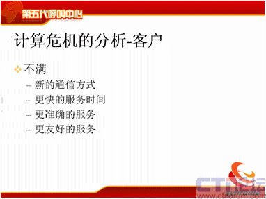 現(xiàn)在我們就分析一下后果,這時候計算危機的分析對于客戶來說,新的通訊方式我們都需要,可是呼叫中心沒有公布,我無法使用,更快的服務(wù)時間,大家看到了,比如說Web Chat,目前我點擊了80%是直接進入留言的頁面,也就是說這時候沒有人工來服務(wù)了,或者是等待時間非常非常長,一個小時以后告訴我,排隊已經(jīng)到了,已經(jīng)沒有人能為我服務(wù)的,服務(wù)時間是根本沒有辦法保證的。第三個方面我們要更準(zhǔn)確的服務(wù),電話打進去以后告訴我的信息和網(wǎng)絡(luò)告訴我的信息是完全不一樣的呢?為什么呢?因為它的知識庫沒有關(guān)聯(lián)起來,業(yè)務(wù)流程沒有關(guān)聯(lián)起來,這種更友好的服務(wù),考核的指標(biāo)都是一樣的。
