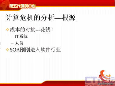 我們分析這個根源,根源其實就是錢的問題,昨天我聽了遠(yuǎn)傳的Bill的講座,講得非常精彩,而且非常幽默,他在整個講的過程中,不斷地提一個次,提了30多次,說是“很花錢”呀,“太花錢”了,“很花錢”。確實是很花錢,呼叫中心是一個燒錢的中心,這是他的理論,其實我的想法也是一樣的。那么對于IT系統(tǒng)來說,確實需要花很多錢,現(xiàn)在的系統(tǒng)大家想想系統(tǒng)要么和CRM對接,要么和ERP對接,有的和供應(yīng)鏈對接,有的和人力資源管理對接,有的和業(yè)務(wù)核心系統(tǒng)對接。那么人員上也是很花錢的,對于外包呼叫中心來說,客戶服務(wù)200座席左右的,人工的成本占到了75%,這個成本是非常高的,確實是很花錢。那么剛才也說了,剛才那些需求,短信的需求,大家看雖然很復(fù)雜,如果給我一千萬的話,我能輕松地把它搞定,給我一年的時間,但這是不現(xiàn)實的。解決的辦法有嗎?有,SOA。SOA是現(xiàn)在軟件行業(yè)一直在做的一件事情,是公認(rèn)的標(biāo)準(zhǔn),但是它剛剛進入中國,而且還都沒有進入呼叫中心。