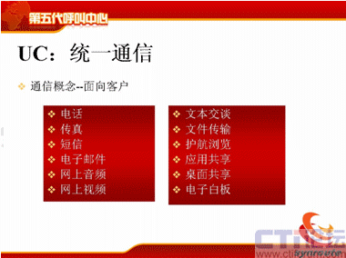那么這幾個特點稍微簡單地說一下,可能大家了解比較多了,從UC上來講,不管是現(xiàn)在國際上比較領(lǐng)先的通信廠商,CISCO、華為都在提UC的概念,軟件行業(yè)包括微軟。UC包括了通信的渠道,包括電話、傳真、短信、電子郵件、網(wǎng)上音頻、視頻,文本交談,文件傳輸、護航瀏覽、應(yīng)用共享、桌面共享等等,這是統(tǒng)一通信的部分。