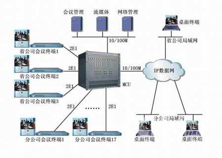 該系統(tǒng)基于蘇州科達(dá)公司KDV系列視頻會(huì)議產(chǎn)品,全網(wǎng)采用1套MCU、20套會(huì)議室型終端和200多套桌面型終端,其中會(huì)議室型終端通過(guò)2條E1線路捆綁與MCU相連、桌面型終端通過(guò)10/100M以太網(wǎng)和IP數(shù)據(jù)網(wǎng)與MCU相連?傮w網(wǎng)絡(luò)結(jié)構(gòu)如下圖所示: