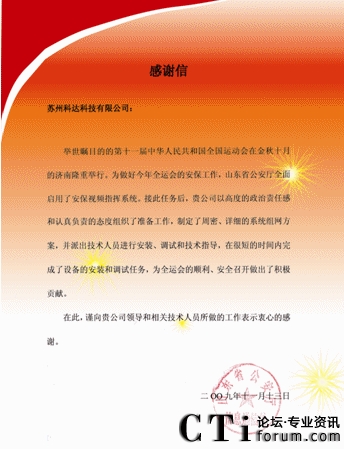 CTI論壇(ctiforum)12月29日消息(記者 張塵):日前 ,山東省公安廳向蘇州科達(dá)科技有限公司發(fā)來感謝信,對蘇州科達(dá)為保障全運(yùn)會順利、安全召開所做的貢獻(xiàn)表示衷心的感謝。