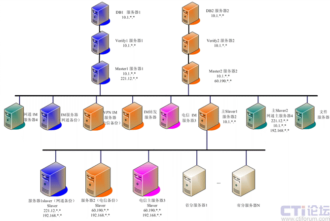 系統(tǒng)基礎(chǔ)平臺的部署采用4臺物理服務(wù)器方式實現(xiàn),四臺物理服務(wù)器分別有多塊網(wǎng)卡,為不同網(wǎng)絡(luò)用戶提供不同服務(wù),同時實現(xiàn)實現(xiàn)核心數(shù)據(jù)的冗余、備份。在二級機(jī)構(gòu),即在省級每個省部署一臺分服務(wù)器,實現(xiàn)當(dāng)?shù)赜脩舻臄?shù)據(jù)轉(zhuǎn)發(fā)等任務(wù),系統(tǒng)部署入下圖所示: