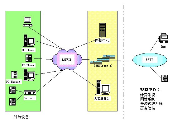 控制中心:包括資源管理系統(tǒng)、計費系統(tǒng)、網(wǎng)管系統(tǒng)、語音信箱。 其中,資源管理系統(tǒng)主要執(zhí)行地址翻譯、權限控制、路由管理等功能;計費系統(tǒng)主要完成計費及結(jié)算功能;網(wǎng)管系統(tǒng)完成對網(wǎng)絡及IP