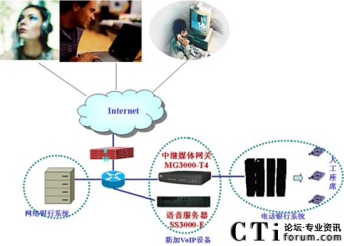 通過上述三環(huán)節(jié),Internet上的電話呼叫即可送入電話銀行的人工座席處,Internet上的客戶也就可以通過計(jì)算機(jī)上的耳麥和電話銀行座席人員通話。拓?fù)涫疽鈭D如下: