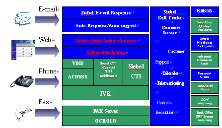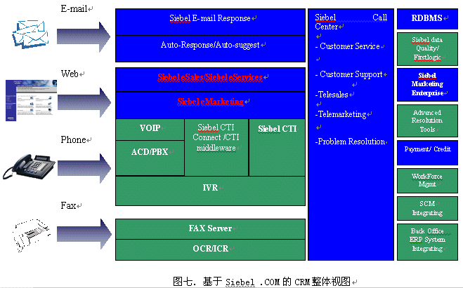 電子商務(wù)網(wǎng)站的運作和企業(yè)網(wǎng)站的建設(shè),為其帶來了更多的市場商機(jī),嶄新的客戶接觸的機(jī)會?蛻粼谝幻腌妰(nèi)就能決定是選擇你還是別人,可以說未來網(wǎng)戰(zhàn)、傳統(tǒng)企業(yè)的競爭就是客戶關(guān)系的競爭;網(wǎng)站要生存,企業(yè)要發(fā)展,關(guān)鍵要在發(fā)展客戶關(guān)系上下功夫。如何涉足CRM領(lǐng)域,如何盡快地利用CRM先進(jìn)的客戶關(guān)系管理理念,是擺在網(wǎng)站和傳統(tǒng)企業(yè)面前的一個棘手問題。以基于Siebel .COM應(yīng)用為涉足CRM的切入點,使企業(yè)能夠更好地實施電子商務(wù)計劃,積極發(fā)展基于Web的客戶關(guān)系管理,最終使網(wǎng)站和企業(yè)真正成為接觸客戶、了解客戶、服務(wù)于客戶的商務(wù)平臺,繼而不斷向完整的企業(yè)級CRM目標(biāo)邁進(jìn)。圖七展示出完整的基于Siebel .COM的CRM視圖。