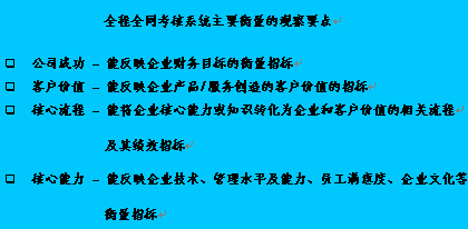 根據(jù)公司制定的策略目標,將平衡記分卡體系引入客戶服務的全程全網(wǎng)考核系統(tǒng)當中,這一體系能比較全面和客觀地反映客戶關系中心的運營績效。完成整個全程全網(wǎng)考核系統(tǒng)設計的關鍵的成功因素為: