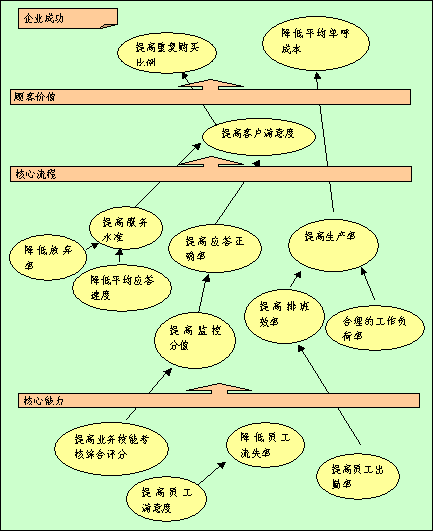 全程全網(wǎng)考核策略目標因果關系圖是"平衡計分卡"應用的重要環(huán)節(jié),在此要特別強調(diào)?因為它是將根據(jù)公司遠景規(guī)劃以及使命確定的四個考核維度轉(zhuǎn)化為全程全網(wǎng)考核系統(tǒng)進入實際操作階段之關鍵步驟。在平衡記分卡的設計過程中,它起著承前啟后的作用,在構建呼叫中心全程全網(wǎng)考核系統(tǒng)中全程全網(wǎng)考核策略目標因果關系圖的突破性銜接功能-以其邏輯性的架構來界定和描述實現(xiàn)全面績效考核的策略方案。將公司成功、客戶價值、核心流程和呼叫中心核心能力之間的關聯(lián)清晰地呈現(xiàn),并將企業(yè)的策略與其績效衡量系統(tǒng)相銜接。