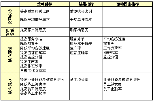 1)公司成功;2)客戶價值;3)核心流程;4)核心能力;成為呼叫中心全程全網(wǎng)考核衡量的四大維度,實際反映了呼叫中心運營管理中成本、客戶、內(nèi)部流程及呼叫中心的學習與成長的四個至關重要的領域,是實現(xiàn)公司遠景規(guī)劃與使命的營運管理核心。