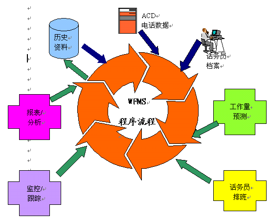 如上面所描述的WFMS流程,最初開始于歷史的電話信息、目前的ACD數(shù)據(jù)和服務(wù)代表的簡介。從這些綜合的信息,做出對工作量的預(yù)測,從而從本質(zhì)上決定了配備給呼叫中心的服務(wù)代表數(shù)量。了解了服務(wù)代表的需求數(shù)量,一個適用于任何時間段的工作時間表就可以產(chǎn)生了,包括每天的,每周的,每月的;谶@一點,主管人就可以監(jiān)控服務(wù)代表的行為,追蹤來電,并分析不同種類的來電分組,做出應(yīng)對假定情景的方案,從而產(chǎn)生各種各樣的報告和圖表。