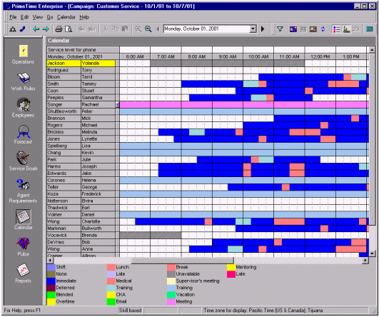 絕大多數(shù)的WFMS可以通過歷史數(shù)據(jù)和人員情況自動生成排班表。而且它也只是簡單的根據(jù)呼叫中心的運(yùn)營時(shí)間來排班。舉個(gè)例子,某個(gè)呼叫中心在排班是有兩個(gè)班,一個(gè)工作時(shí)間是早7點(diǎn)到下午3點(diǎn),另一個(gè)是早九點(diǎn)到晚五點(diǎn),這就意味著不僅要安排早、晚休息,還要顧及到午休的時(shí)間。休息的安排要保證能夠在電話的持續(xù)中也能有持續(xù)的人員保證電話量。在這個(gè)自動化軟件的之中還有一個(gè)因素要能夠?qū)崿F(xiàn)自動化--人的因素。例如:Mary和Jane想同時(shí)去吃午餐,然而自動化的排班表并不是這樣的。然而主管根據(jù)當(dāng)時(shí)的話務(wù)量情況和工作狀況以及工作規(guī)范批準(zhǔn)了Mary和Jane共享午餐的要求,而WFMS就要能夠處理這樣很有可能發(fā)生,而且是合理的情況。排班表的更改應(yīng)該就是簡單的拖拽圖標(biāo)就應(yīng)該能夠?qū)崿F(xiàn)的功能,并且能夠在這種更改會對預(yù)測的話務(wù)量差生不好影響時(shí),拒絕這種拖拽行為。