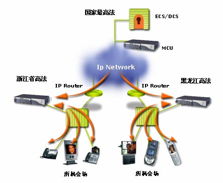 MCU視頻會(huì)議交互平臺(tái),組成了由24臺(tái)RADVISION MCU實(shí)現(xiàn)的最高法院-22個(gè)省級(jí)法院-地(市)法院的3級(jí)視頻會(huì)議網(wǎng)絡(luò)。RADVISION建設(shè)的視頻會(huì)議系統(tǒng),既可以實(shí)現(xiàn)每個(gè)省單獨(dú)同時(shí)或分時(shí)靈活組建省—地(市)兩級(jí)視頻會(huì)議,也可以召開(kāi)最高法院—22個(gè)省級(jí)法院—地(市)法院的3級(jí)視頻會(huì)議,并實(shí)現(xiàn)了最高法院對(duì)地(市)法院視頻會(huì)議終端的直接控制和管理。