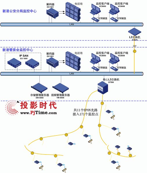 除了攝像頭與圖像顯示設(shè)備之外,整個(gè)監(jiān)控系統(tǒng)主要采用的都是H3C設(shè)備。系統(tǒng)用11(應(yīng)改成10條,最終只用了10條)條EPON光路接入全部171個(gè)監(jiān)控?cái)z像頭;并采用專業(yè)的EX1000存儲產(chǎn)品為120T關(guān)鍵歷史視頻數(shù)據(jù)的提供了高可靠性的存儲保護(hù);而S7506、S3600交換機(jī)優(yōu)化的組播特性和特色的雙流技術(shù)則確保了所有監(jiān)控點(diǎn)的高清晰、高實(shí)時(shí)性、支持大量并發(fā)訪問。系統(tǒng)的集中管理、批量配置、全網(wǎng)網(wǎng)管也可以為新港開發(fā)區(qū)節(jié)省管理成本。