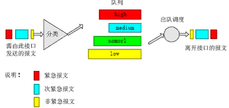 在報(bào)文到達(dá)路由設(shè)備接口后首先對報(bào)文進(jìn)行分類,然后按照報(bào)文所屬的類別讓報(bào)文進(jìn)入所屬隊(duì)列的尾部,在報(bào)文發(fā)送時(shí)按照優(yōu)先級總是在所有優(yōu)先級較高的隊(duì)列中的報(bào)文發(fā)送完畢后再發(fā)送低優(yōu)先級隊(duì)列中的報(bào)文,這樣在每次發(fā)送報(bào)文時(shí)總是將優(yōu)先級高的報(bào)文先發(fā)出去,保證了屬于較高優(yōu)先級隊(duì)列的報(bào)文有較低的時(shí)延與丟失率。