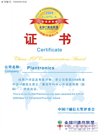 在近日結(jié)束的CIPCA2008年度中國IP通訊大獎評選中,繽特力(Plantronics) 榮獲“最佳呼叫中心外設提供商(國際類)”稱號。