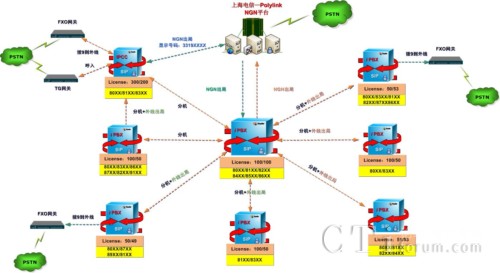 2.使用Polylink提供的VoIP語音服務(wù),用戶撥打021-3319XXXX號(hào)碼時(shí),電話直接經(jīng)過Polylink提供的電信VOIP線路,經(jīng)過IP傳送將電話送至IPBX系統(tǒng),再經(jīng)過IPBX系統(tǒng)根據(jù)相應(yīng)號(hào)碼選擇相應(yīng)公司進(jìn)行呼叫。