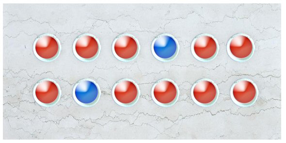 某一個呼叫中心,在它廁所上頭,裝了這樣一個裝置。這裝置如下面的圖所示,有12個燈號,燈號有兩種顏色,一種是紅色,一種是藍色,有時會變成紅色,有時又會變成藍色。