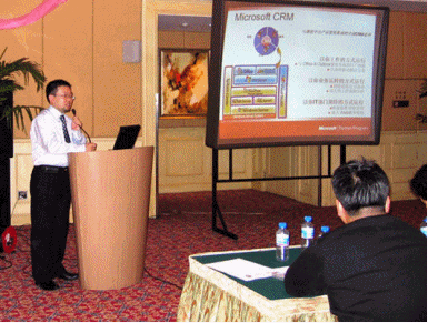 微軟公司負(fù)責(zé)天津地區(qū)的夏玉玲小姐在簡短的開幕式后首先發(fā)表演講,介紹了微軟為商業(yè)應(yīng)用開發(fā)的各種商務(wù)解決方案(MBS)。其后通用咨詢公司總經(jīng)理鄭明先生上臺演說,其演講主題將營銷管理理論體系與微軟CRM密切結(jié)合,博得了與會(huì)者贊同的掌聲。
