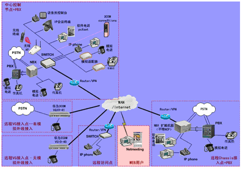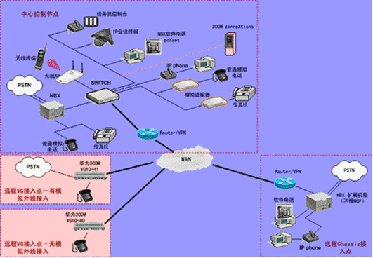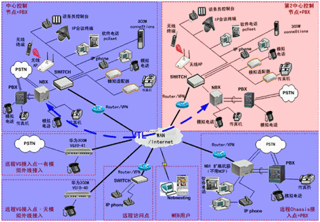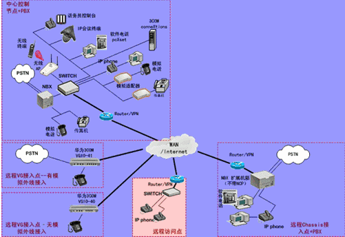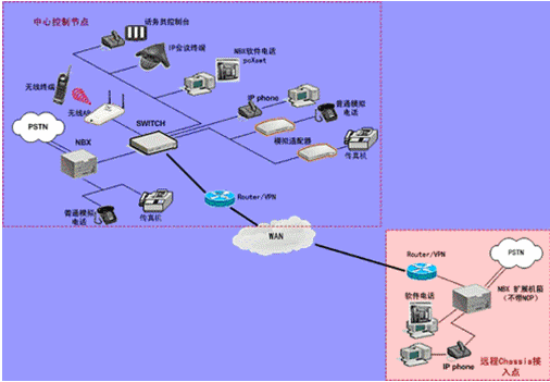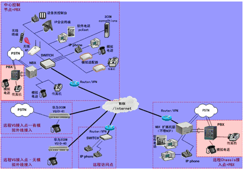 IPPBX將成為企業(yè)辦公不可缺少的一部分。此方案適合于已經(jīng)有PBX的公司,由于先期已經(jīng)投入了PBX設(shè)備,費用昂貴,所以不會輕易被替換。在外地有多家分公司,使用傳統(tǒng)電話通訊費用很高,希望能降低成本。并希望在分公司所在城市可以通過當(dāng)?shù)氐腜STN落地,節(jié)省長途費用。依照客戶的需求,我們制定了以下方案: