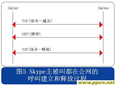 查找到希望連接的用戶后,可以將其加入好友列表,Skype用戶可以隨時(shí)與在線的好友進(jìn)行呼叫。經(jīng)過(guò)了稍微復(fù)雜的認(rèn)證過(guò)程和用戶查找過(guò)程,呼叫建立和釋放的過(guò)程就變得簡(jiǎn)單了。用戶位于公網(wǎng)和位于私網(wǎng)內(nèi)部的情況會(huì)有所不同,兩種情況下的呼叫建立和釋放流程分別見(jiàn)圖5和圖6所示。