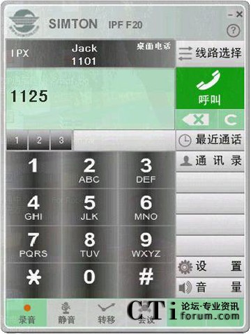 三通科技此次推出的第二代電腦軟電話Simton IPF F20,除完全保留前一代產(chǎn)品F10的操作簡便性、F12的多賬號(hào)注冊外,更在電子通訊錄、綁定臺(tái)式電話機(jī)等方面帶給用戶全新的使用體驗(yàn)。IPF F20型軟電話可注冊到任意型號(hào)的Simton IPX(IPPBX)產(chǎn)品上成為IPX的分機(jī),隨筆記本電腦移動(dòng)使用;也可安裝在臺(tái)式的辦公電腦上與原有臺(tái)式電話機(jī)綁定使用。Simton IPF F20型軟電話分為個(gè)人和企業(yè)2個(gè)版本,個(gè)人版可在三通科技官網(wǎng)(cn.simton.com)“三通產(chǎn)品”頻道免費(fèi)下載,下載后無需安裝,只要將分機(jī)號(hào)碼等信息填入即可開通。