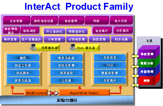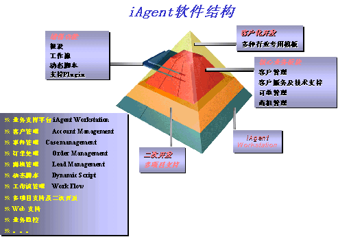iAgent3.0從軟件內(nèi)部的結(jié)構(gòu)體系上加以突破,統(tǒng)一開放的應用平臺上組合功能強大的二次開發(fā)工具,并在此基礎上加以針對行業(yè)而特別設計的功能模板。更好的適應了企業(yè)處理流程的多樣化和需求的復雜化,并為企業(yè)高速的業(yè)務增長和功能需求增長帶來極大的拓展空間。軟件結(jié)構(gòu)如下圖所示:
