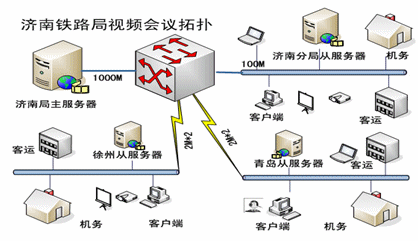 濟(jì)南鐵路局規(guī)模龐大,機(jī)構(gòu)復(fù)雜,由于鐵路的特殊性,一個(gè)部門或機(jī)構(gòu)往往分布在鐵路沿線的數(shù)十個(gè)站段。因此,溝通和會(huì)議的模式也是多種多樣的,會(huì)議使用單位較多而且頻繁,這就對(duì)網(wǎng)絡(luò)視頻會(huì)議系統(tǒng)提出了很高的要求,即能滿足當(dāng)?shù)氐臅?huì)議,又要能夠滿足跨區(qū)域的會(huì)議。