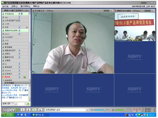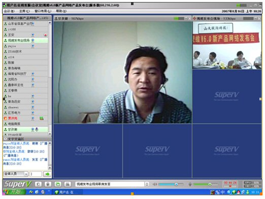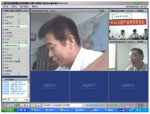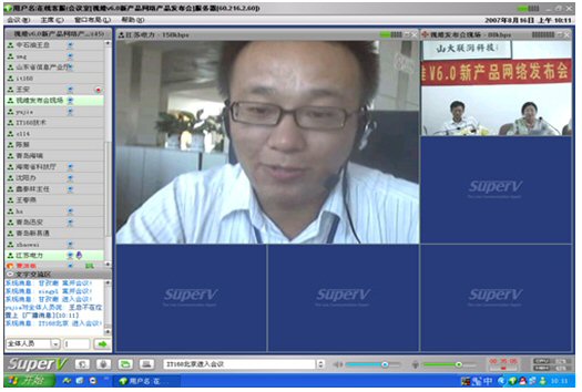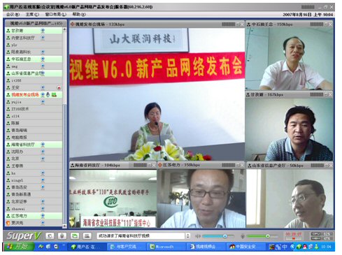 2007年8月16日,視維視頻會議V6.0新產品網絡發(fā)布會在美麗的泉城濟南舉行,山東省信息產業(yè)廳、濟南市信息產業(yè)局的領導、山東省電信等上級主管部門領導,視維產品新老用戶和有視頻會議需求的潛在客戶,國內外合作伙伴,IT168、中國計算機報、電腦商報、C114、支點網、計算機世界、CTI論壇、投影時代等國內知名媒體100多人參加了這次網絡發(fā)布會。在此次會議上,山大聯(lián)潤公司通過視頻會議與各地與會者進行了良好的溝通,同時這次發(fā)布會開創(chuàng)了用視頻會議發(fā)布新產品的先河。