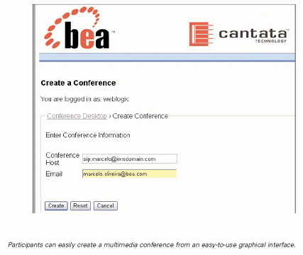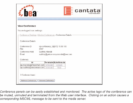 在上述應用中,一用戶建立了一個多媒體會議會話。該會議的進行一如我們平常所熟悉的基于運營商的語音會議系統(tǒng)的商務(wù)會議。不同的是,它使用了基于Web的圖形交互, 使得用戶可以建立會議時間以及受邀請的參與人的列表,此外, 該應用還發(fā)出了一封含有該會議相關(guān)的聯(lián)絡(luò)信息的電子郵件。并且,它還充分利用了Cantata SnowShore 媒體服務(wù)器的高級多媒體功能為會議參與人提供豐富的多媒體體驗。