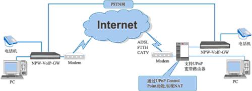 NPW-VoIP-GW作為客戶端VoIP網關置于各個企業(yè)分支機構或家庭用戶桌面。其WAN接口可以連接各類同步modem以PPP方式或使用以太網口接入公網。同時NPW-VoIP-GW上的FXO接口可以連接PBX接入PSTN網絡實現備份功能。如圖所示NPW-VoIP-GW上連接的話機可以直接通過Internet或PSTN撥打對方。