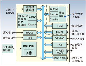 下一代住宅網(wǎng)關(guān)將包括對(duì)多達(dá)4條帶三方會(huì)議功能的語(yǔ)音線路的支持。每條線路可同時(shí)支持與DECT、保密(black)、寬帶或無線電話的連接并支持不同的CODEC;贒SP的實(shí)現(xiàn)與基于需2到3倍DSP周期的通用處理器核的實(shí)現(xiàn)相比,能提供更優(yōu)異的語(yǔ)音處理能力。高性能可編程語(yǔ)音子系統(tǒng)使其可支持各種低位速率CODEC、無線CODEC、寬帶CODEC以及類似傳真和調(diào)制解調(diào)器中繼、包丟失最小化和噪聲削減算法等先進(jìn)特性。
