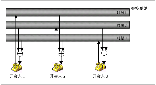 由于會議的資源是分布在各個通道,因此電話會議功能可以具有極大的靈活性,只有一塊卡的小系統(tǒng)也可以擁有電話會議功能,既可以召開所有通道參加的大會議,也可以同時召開一系列參加人數(shù)不同的小會議,會議功能的各項(xiàng)指標(biāo),如會議數(shù)目,會議參加人數(shù),發(fā)言人數(shù)等基本上都不受限制。下圖以一個三方會議的實(shí)現(xiàn)說明分布式電話會議的概念。