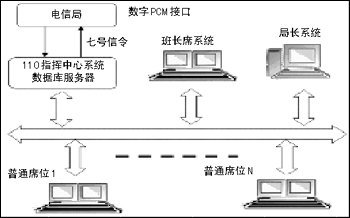 系統(tǒng)由以下部分組成:CTI服務器、接警席位系統(tǒng)、班長席位系統(tǒng)、局長席位系統(tǒng)。各部分系統(tǒng)可根據(jù)實際需求任意組合,各個部分充分考慮到開發(fā)的實用性、可靠性、先進性和開放性,能夠將軟件維護降到最小程度,這樣的設計可以讓用戶能夠改動硬件和數(shù)據(jù)庫,卻不用將軟件整體更換,保證了用戶的投資。其結構如圖2所示。
