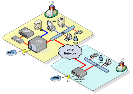 為了進(jìn)一步拓展中國市場,并且針對(duì)某些特定的地方需要提供本地化方言服務(wù),S公司需要在廣州設(shè)立一個(gè)新的座席集群,座席數(shù)量在50左右,需要擁有與中心點(diǎn)一樣完善的功能,實(shí)現(xiàn)呼叫的自由分配,共享中心點(diǎn)設(shè)施,比如CMS(呼叫中心報(bào)表系統(tǒng))、IVR(交互式語音應(yīng)答系統(tǒng))和CDR(呼叫詳細(xì)記錄)等等。并提供最強(qiáng)的穩(wěn)定性和冗余備份功能。