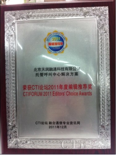 CTI論壇(ctiforum)1月13日消息(記者 潘婷婷): 近日, CTI論壇舉辦的“CTI論壇2011年度編輯推薦獎(jiǎng)”評(píng)選活動(dòng)落下帷幕,天潤(rùn)融通的解決方案成功斬獲了CTI論壇編輯推薦獎(jiǎng)。