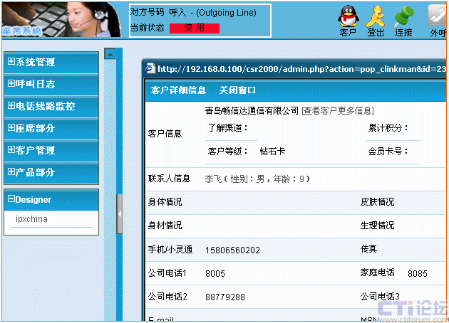 當(dāng)客戶來電轉(zhuǎn)接人工服務(wù)時,自動彈出信息登記窗口并根據(jù)來電號碼檢查客戶資料庫中是否有該客戶的數(shù)據(jù)。如客戶的名稱、地址、聯(lián)系電話、身體狀況、膚色、以往的咨詢、投訴等記錄信息。以及來電日期、時間、受理人等;使座席人員一目了然,第一時間了解來電的相關(guān)信息。