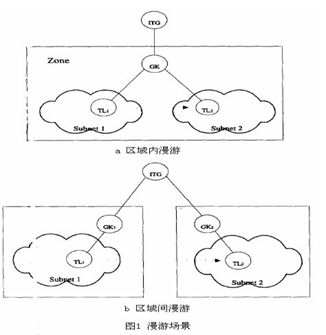H.323定義中,區(qū)域指由H.323實體(終端、ITG、MCU)組成的集合,并由一個網(wǎng)守進行管理。每一個區(qū)域只有一個網(wǎng)守,但允許多個子網(wǎng)通過路由器連接進來。對于這種多子網(wǎng)單網(wǎng)守的特性,我們發(fā)現(xiàn)這與GSM系統(tǒng)中的服務(wù)區(qū)類似,網(wǎng)守就相關(guān)于HLR或者VLR。服務(wù)區(qū)中有移動電話終端和代理管理下的基站,類似的一個區(qū)域中有多個子網(wǎng)并都在一個網(wǎng)守的管理下。當移動IP電話從一個子網(wǎng)漫游到另外一個子網(wǎng)時,IP電話的IP地址就發(fā)生了變化。如果不做移交處理的話,連接將中斷。