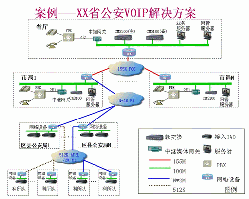 - 在全省公安IP語(yǔ)音專(zhuān)網(wǎng)系統(tǒng)覆蓋范圍以?xún)?nèi)的用戶(hù)通過(guò)專(zhuān)用廣域網(wǎng)接續(xù)。省廳和各市節(jié)點(diǎn)的軟交換均通過(guò)中繼媒體網(wǎng)關(guān)與本節(jié)點(diǎn)PBX互連,全省各區(qū)縣公安局和下轄科所隊(duì)均根據(jù)接入需要配置相應(yīng)端口數(shù)的語(yǔ)音接入設(shè)備IAD,各節(jié)點(diǎn)之間專(zhuān)網(wǎng)電話(huà)匯接、路由通過(guò)IP網(wǎng)絡(luò)來(lái)完成。