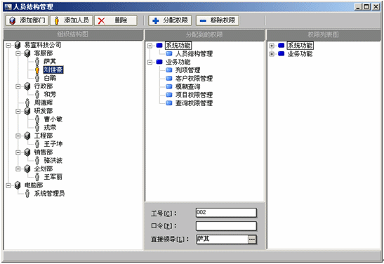 在這一模塊,管理員可以自由設(shè)置人員結(jié)構(gòu)、系統(tǒng)權(quán)限、客戶(hù)權(quán)限、查詢(xún)權(quán)限等;可以根據(jù)業(yè)務(wù)的需求在數(shù)據(jù)字典里自行添加報(bào)表或字段,并且設(shè)定業(yè)務(wù)表之間的關(guān)聯(lián)性;還可進(jìn)行工作流的設(shè)定與分配,等等。