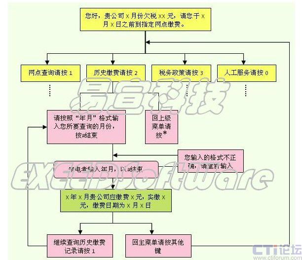 - 播放內(nèi)容為IVR交互式語音流程(也叫語音架構(gòu)),用戶和稅務(wù)部門能夠通過用戶的選擇產(chǎn)生互動(dòng)交流;