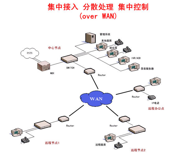 VoIP 技術(shù)與呼叫中心的結(jié)合,不僅僅讓用戶享受到Internet帶來的大量話費(fèi)的節(jié)約,更使基于Internet連接的分布式呼叫中心成為可能。分布式的呼叫中心系統(tǒng),集中式的管理,才能真正滿足那些擁有多個分支機(jī)構(gòu)的行業(yè)和企業(yè)用戶建設(shè)呼叫中心的需求;贗P分布式的NBX呼叫中心平臺支持遠(yuǎn)端坐席,利用現(xiàn)有的企業(yè)專線實(shí)現(xiàn)分布呼叫,同時簡化管理,由于人工坐席技能差異、語言差異、呼叫量的差異,以及客戶中心客戶所在地的變化及每個客戶對各自所擁有的用戶資料的保密性需求,分布式呼叫中心往往更適合各類企業(yè)的實(shí)際。分布式呼叫中心的建立,意味著需要在多個分中心之間進(jìn)行統(tǒng)一的呼叫控制及語音與同步數(shù)據(jù)轉(zhuǎn)移。NBX作為IP-PBX的引入,兩網(wǎng)合一的特性使分布式呼叫中心的建立成為了一件非常容易的事情。呼叫中心可以擴(kuò)展到多個位于不同地域的局域網(wǎng)上,通過路由選擇可以自動地把呼叫(語音)和數(shù)據(jù)從一個地點(diǎn)轉(zhuǎn)到另一個地點(diǎn)中心,因?yàn)檎Z音數(shù)據(jù)通過同一網(wǎng)絡(luò),語音和數(shù)據(jù)同步轉(zhuǎn)移是很自然的。由于數(shù)據(jù)和語音全部通過以太網(wǎng)傳輸,所以不用支付昂貴的長途話費(fèi),降低了企業(yè)及客戶的開銷,同時由于各分支機(jī)構(gòu)可將各自的客戶資料保存在各分中心,這樣不僅大大降低了呼叫中心對數(shù)據(jù)庫的維護(hù)管理工作,也節(jié)約了設(shè)備投入及運(yùn)營維護(hù)成本。