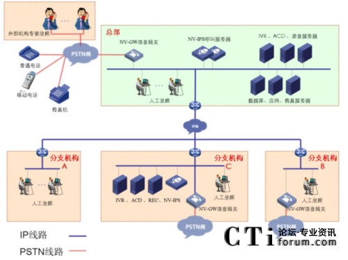 NV-IPS呼叫中心充分利用IP呼叫中心部署簡單、靈活的優(yōu)勢,支持多種應用模式:集中接入,集中處理;集中接入,分散處理;分散接入,集中處理;分散接入,分散處理,實現分布式呼叫中心負荷分擔和資源共享。