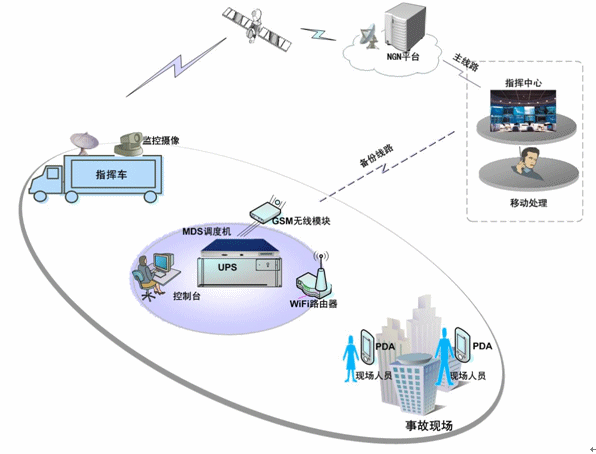 MDS調度機通過衛(wèi)星道與政府的NGN平臺對接,實現與整個城市的通信系統(tǒng)對接;并通過GSM、CDMA備份線路,實現多通信通道的實時切換,選擇最好的路由進行通信。MDS調度機負責語音通訊、調度作業(yè)和指令消息轉發(fā);應急指揮車配備調度機、調度臺、移動調度終端、衛(wèi)星接收設備、監(jiān)控視頻設備及其他設備。所有的調度語音終端都可與MDS調度系統(tǒng)對接,實現調度功能及與其他的通信終端進行通信。