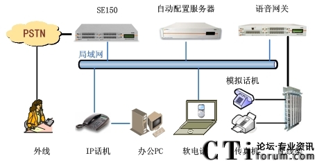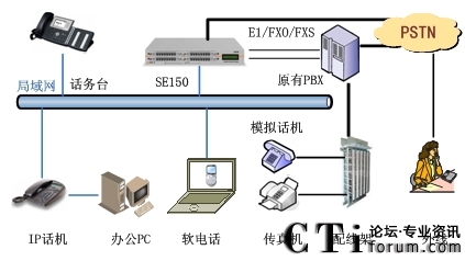 此方案適用于已經部署了傳統PBX的企業(yè)。要求企業(yè)部署好數據網絡,如果采用模擬終端,則企業(yè)的各個辦公點需要先將網絡線路和電話線路部署到位,同時企業(yè)原有的PBX要預留與SE150對接的接口。