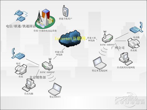 BiPAC 6404VGP其實就是一個VoIP語音網(wǎng)關(guān),VoIP就是一種把語音信號轉(zhuǎn)換成在網(wǎng)絡(luò)上傳輸?shù)臄?shù)字信號的技術(shù),它的應(yīng)用已經(jīng)非常成熟,我們經(jīng)常使用的QQ語音聊天功能也就是VoIP的一種表現(xiàn)形式。在所有大型跨國企業(yè)里我們幾乎都能看到VoIP技術(shù)的身影,這是因為電信運(yùn)營商的長途電話費(fèi)一般都不便宜,而我們企業(yè)的網(wǎng)絡(luò)使用費(fèi)一般又是包月的,通過無限包月的網(wǎng)絡(luò)打免費(fèi)的國際國內(nèi)長途電話不就是占電信的便宜嘛?