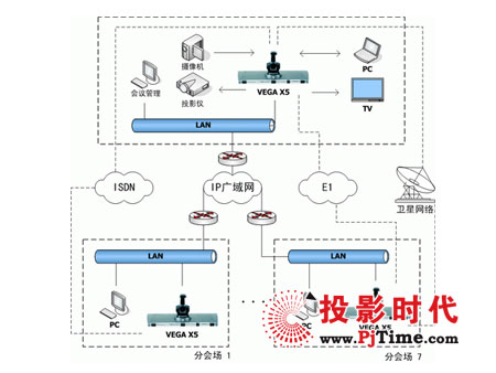 如圖所示,主會(huì)場(chǎng)配置1臺(tái)愛(ài)斯樂(lè)VegaX5終端,X5最高帶寬可達(dá)4Mbps。內(nèi)置8點(diǎn)混網(wǎng)(IP&ISDN) MCU。在每個(gè)分會(huì)場(chǎng)采用1臺(tái)愛(ài)斯樂(lè)VEGA X3終端。各會(huì)場(chǎng)根據(jù)網(wǎng)絡(luò)情況,可以采用不同的網(wǎng)絡(luò)接入方式。VEGA X5可以支持寬帶IP、ISDN、專線接入等。且X5的內(nèi)置MCU在召開多點(diǎn)會(huì)議時(shí)可以做雙視頻流傳送,可以同時(shí)看到多會(huì)場(chǎng)的圖像,聲音也是全部混合的。