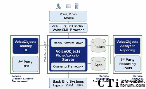 VoiceObjects體系結(jié)構(gòu)支持輕松地開(kāi)發(fā)、部署和維護(hù)帶有語(yǔ)音、視頻、文本和移動(dòng)互聯(lián)網(wǎng)接口的電話(huà)應(yīng)用。通過(guò)緊密集成提供實(shí)時(shí)分析的VoiceObjects分析器和提供應(yīng)用創(chuàng)建與維護(hù)的VoiceObjects桌面,VoiceObjects服務(wù)器成為提供動(dòng)態(tài)對(duì)話(huà)和接口生成的執(zhí)行引擎。